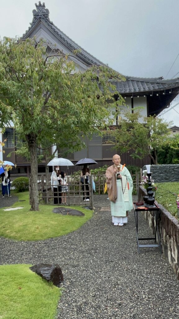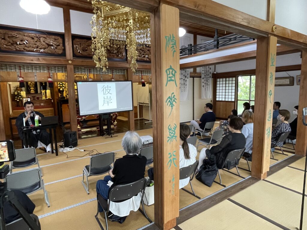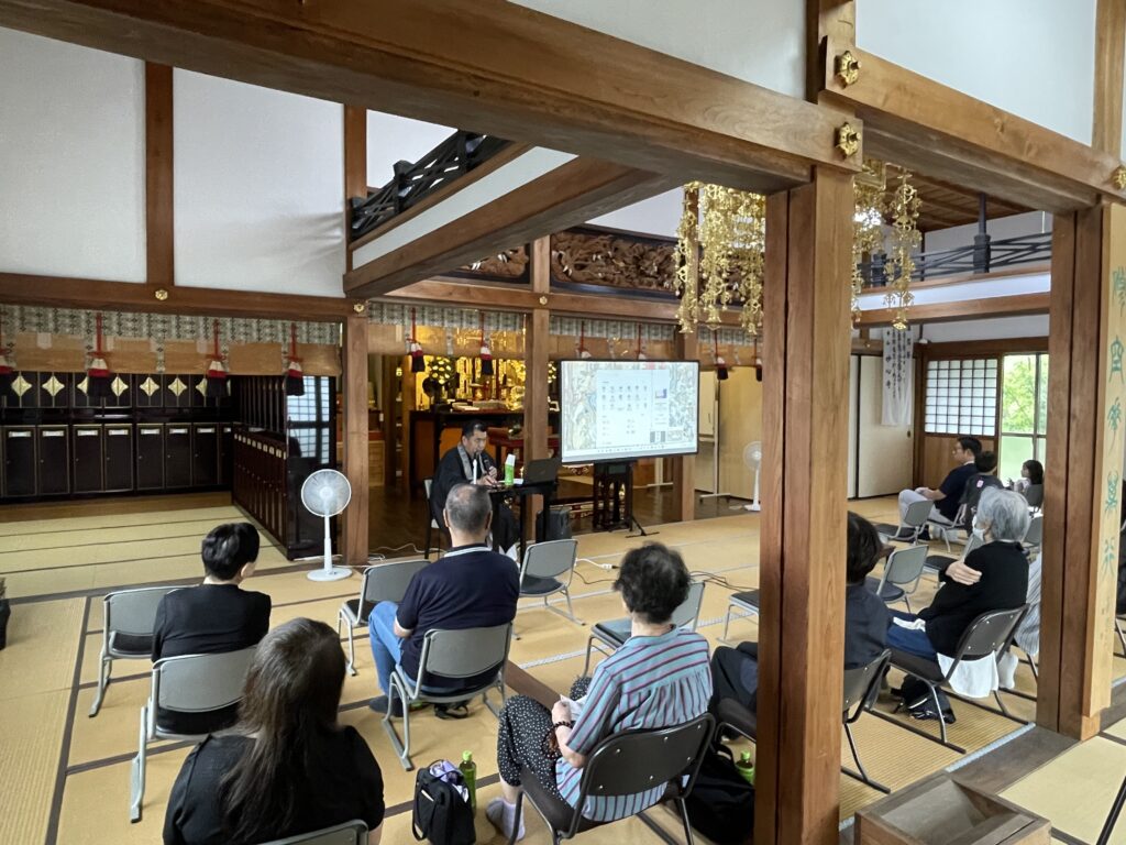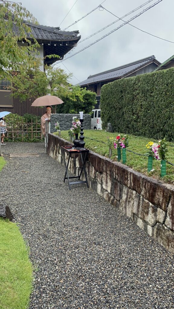 小雨が降る中、墓前でのお勤めをさせていただきました。その後、本堂での法話が30分ほどありました。講師に三重県津市の真宗高田派の潮音寺ご住職の村上英俊さんをお迎えしました。